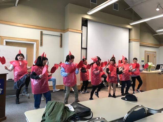 最後には、いつも学生たちのパーフォーマンスが予定されています。今年はあまり練習している様子もなかったのですが、「エビカニックス」の英語版を披露してくれました。真っ赤な衣装はちょっと衝撃的でしたが、それが良かったようですよ。できたら、踊り方をみんなに教えてくれて、子どももおとなも一緒に体操ができればよかったですね。子どもたちもいたので喜んだことでしょう。来年の学生たちへの助言にしましょう!