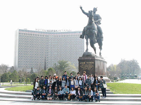 3月20日午前、晴れ。 暑い日差しの中、午前中はウズベキスタン世界言語大学の学生と、市内観光をしました。午前中は、ホテルから歩いてアミールティムール広場、ナヴォイ劇場、ウズベキスタンにある平山郁夫美術館に行きました。