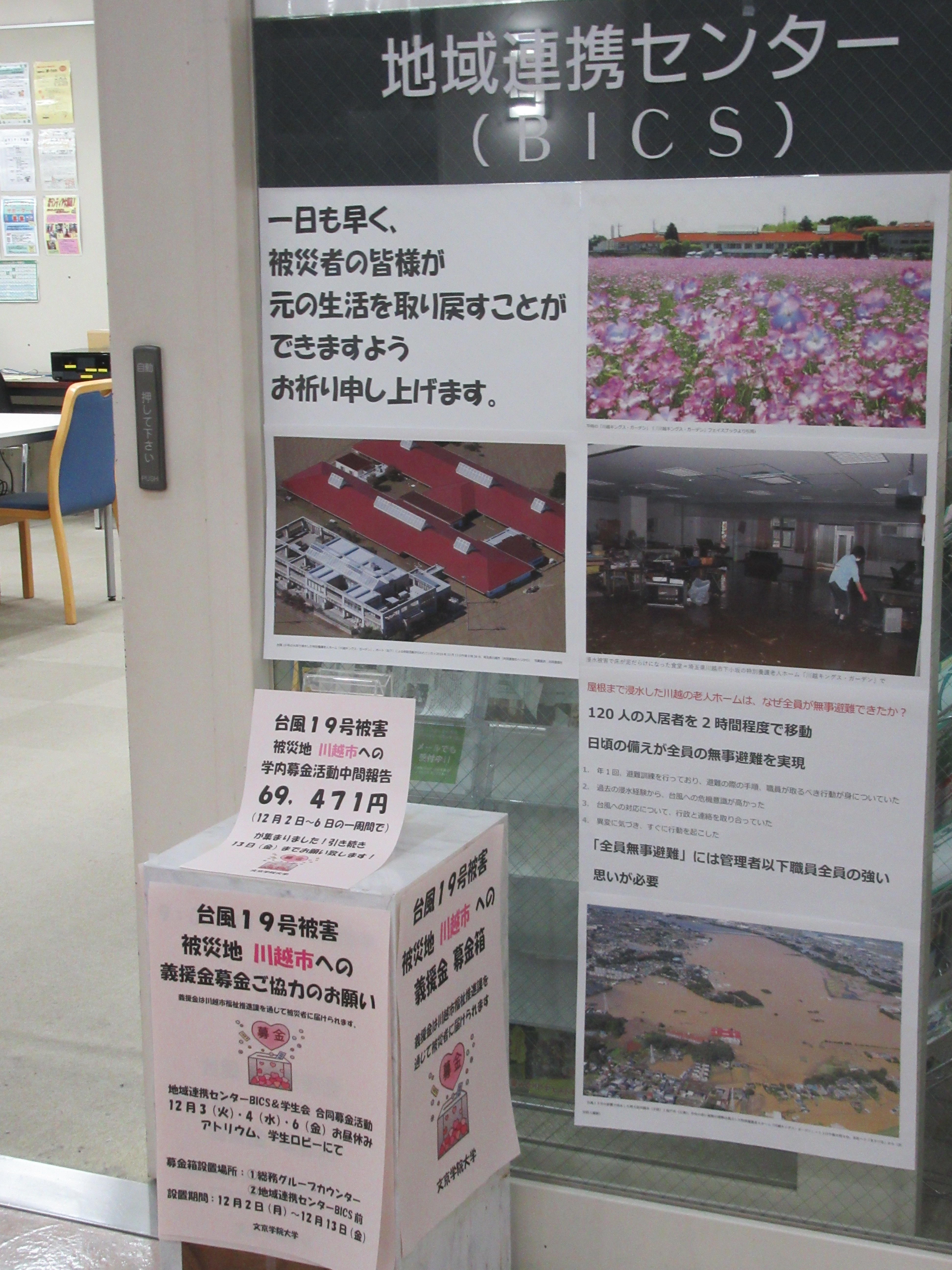 2019年10月12日(火)の台風19号の上陸で、近隣の川越市内でも大きな被害がありました。当初、ボランティア活動に出向く予定でしたが、川越市のボランティアセンターが閉所となり、それに伴い、12月3日(火)、4日(水)、6日(金)にふじみ野キャンパス学生会と合同で、お昼休みでの募金活動になりました。また、地域連携センターBICS前と総務グループカウンターの2か所に募金箱を設置し、2週間で88,017円が集まりました。ご協力ありがとうございました。