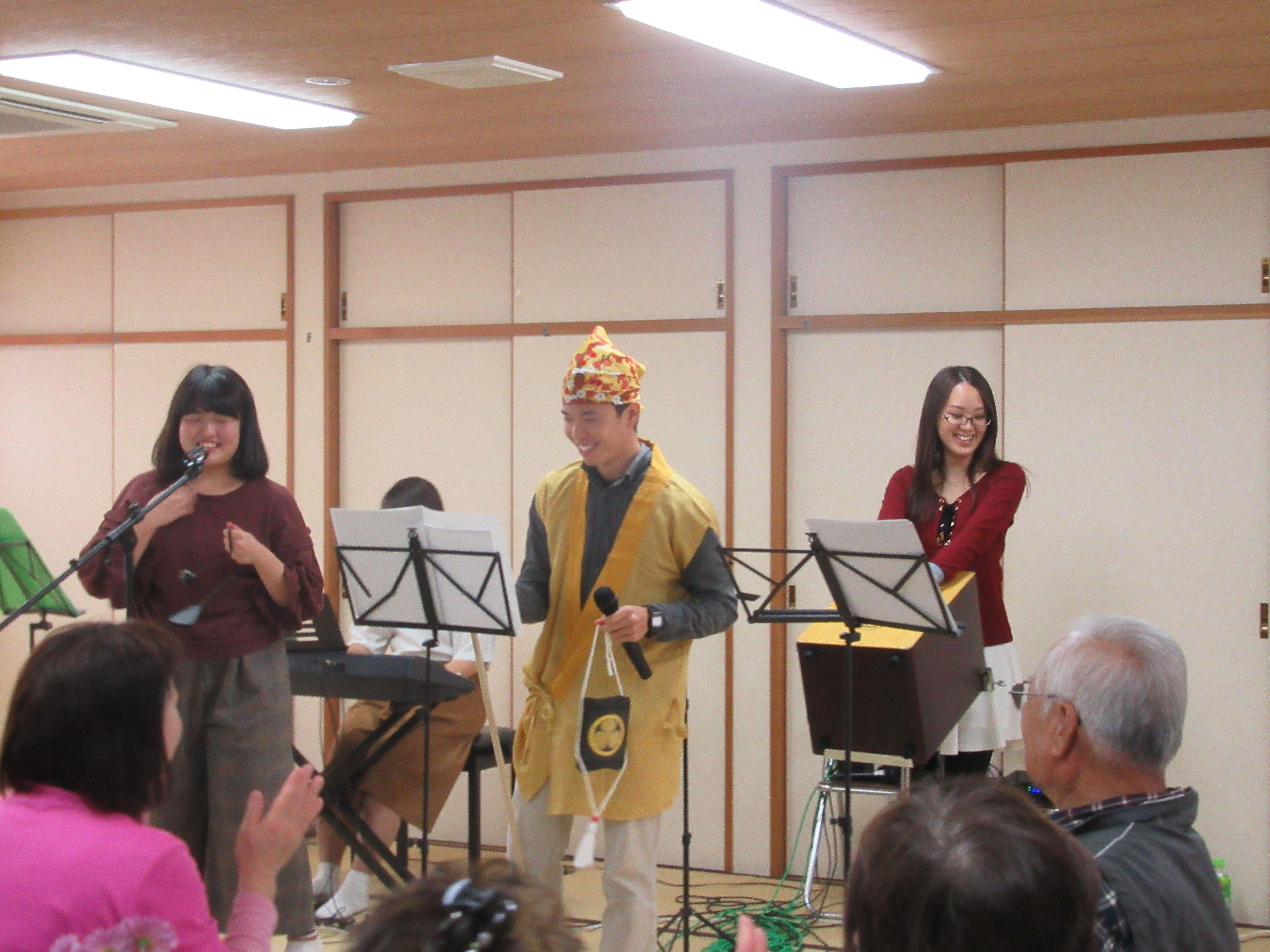 地域の皆さんと一緒に歌った「もみじ」、エッグシェイカー(卵形のマラカス)を一緒振った「高原列車は行く」、若すぎる水戸黄門様の登場の「ああ、人生に涙あり」、きれいにハモってブラボー!とアンコール!を頂いた「かわいいベイビー」、演奏後はお茶、お菓子を一緒に頂きならが歓談、交流をしてきました。