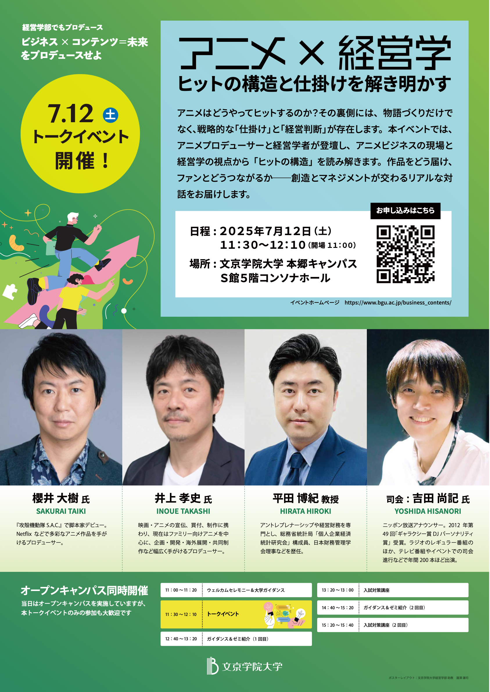 経営学部で「プロデュース」を学ぶことは可能か?──アニメーション、映画、音楽など多様なコンテンツ業界で活躍するゲストを招き、制作現場のリアルとビジネスの論理を交差させる鼎談を開催。コンテンツ制作の裏側にある意思決定、資金調達、ブランド戦略、ファンとの関係構築などを経営学的に読み解き、創造とマネジメントの接点を探ります。エンタテインメントやコンテンツのみならず、企画や開発に興味のある全ての方必見!