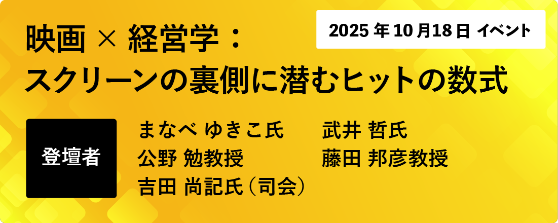 映画はどうやってヒットするのか?映画は物語や映像の力、そして映画ならではの事業戦略や資金計画といった、さまざまな経営的判断が関わっています。本イベントでは、脚本家と映画プロデューサー、コンテンツ学者と経営学者が登壇し、映画ビジネスの舞台裏を紐解きます。作品を生み出し、届け、ファンとつながるまでの過程を、創造とマネジメントの視点から語り合います。