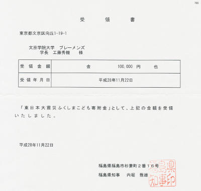 寄付報告 2015年 合計 ¥577,513 ■2016年11月22日 ¥100,000-を「いわて学び希望基金」へ寄付致しました。 ■2016年11月22日 ¥100,000-を「東日本大震災みやぎこども育英基金」へ寄付致しました。 ■2016年11月22日 ¥100,000-を「東日本大震災ふくしまこども寄附金」へ寄付致しました。 ■2017年4月7日 ¥277,513-を「子どもの村東北」へ寄付致しました。 戻る