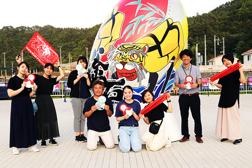 ブレーメンズ は、釜石からのおもてなしとして、自らがデザインし、水上印刷様に印刷加工いただいた「ねば~だるま」型うちわを、ファンゾーン来場者に配布。また鵜住居駅でもおかえりになる一人一人に声をかけ、釜石へ来てくれた感謝の気持ちを込め手渡しすると、ユニークなデザインに「何だろうこれ?」「可愛いうちわ!」と、皆様明るい笑顔で受け取り頂きました。