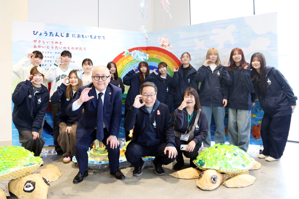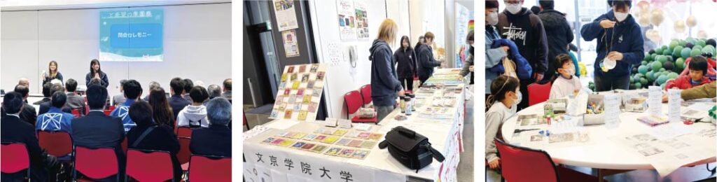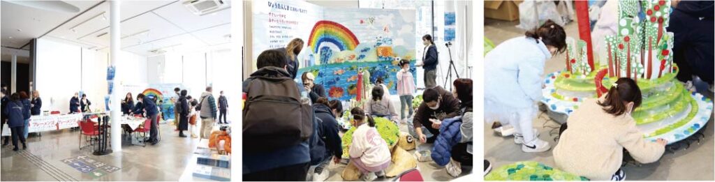 本学ブースでは、絵本の世界をテーマにしたリサイクルアート展示や、海の生き物をモチーフにしたワークショップを展開。学生16名が参加しました。