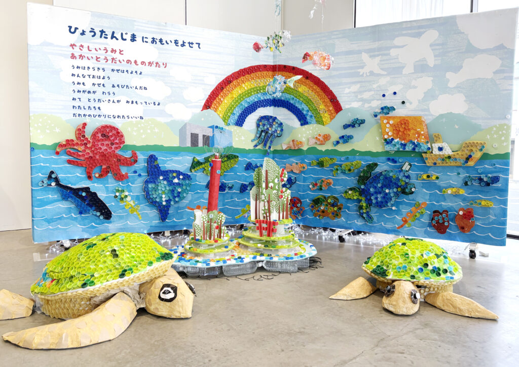リサイクルアート企画「みんなでつくる飛び出す絵本」では、子どもたちがカラフルなペットボトルキャップを使い、大きな飛び出す絵本のパネルや、大槌町のひょうたん島をモチーフにしたオブジェ、仲良し2匹の海亀に貼り付けながら作品づくりを楽しみました。
