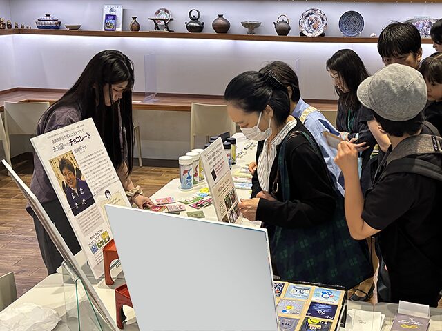 岩﨑昭子氏(ぷらーじょねばま)のチョコレート販売をサポート。学生がデザインした9種類のラベルパッケージを採用し、授業で培ったマーケティング・デザインの知識を活かして起業支援に取り組みました。