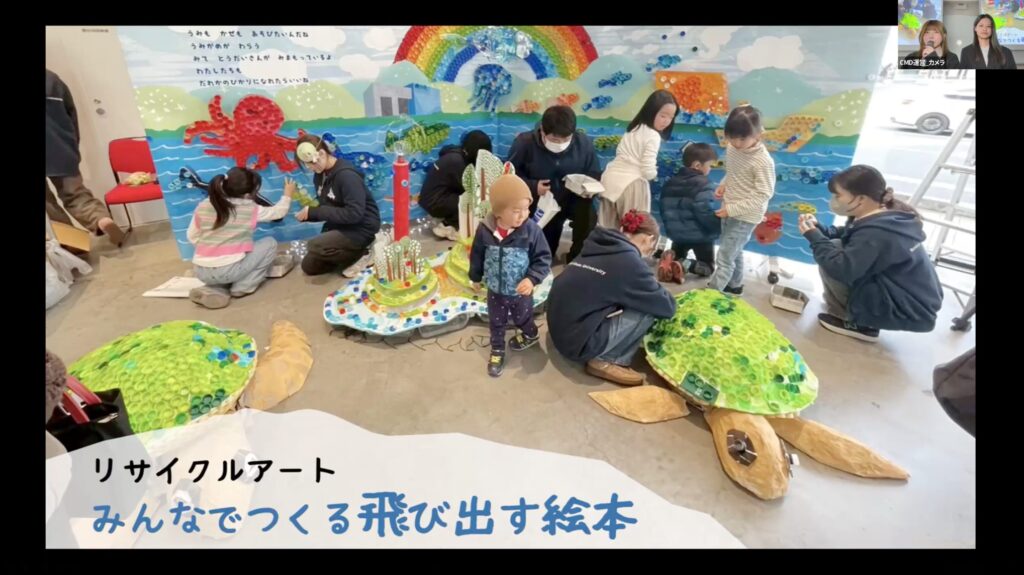 釜石市主催「海と希望の学園祭」に参加し、廃材に新たな価値を生み出すリサイクル素材を活用したアート展示とワークショップを実施しました。海のいきものたちを題材にした絵本や、大槌町にある「ひょうたん島」のモデルとなった蓬莱島の展示を行い、来場者や地域住民との交流を通じて、地域の賑わいづくりに貢献しました。