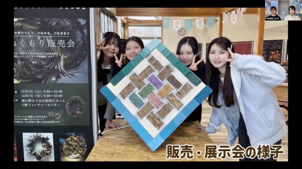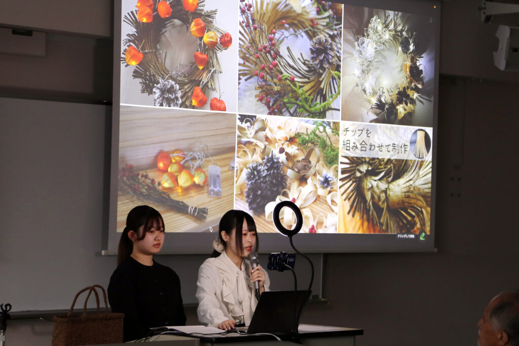 盛岡市の未活用資源である木材の皮に着目し、学生が材料採取から加工、ターゲットやニーズの検討を行い、籠やリースを制作。あわせて、盛岡市初の道の駅「たみっと」のロゴを、コンセプトである「つながる・つむぎあう」を表現して制作しました。完成した作品は、販売・展示までを一貫して実施し、リースは「Waのまちもりおかリース展」では準グランプリを受賞しました。地域の技術者の指導のもと、地域資源の価値創出と実践的な商品開発に取り組みました。