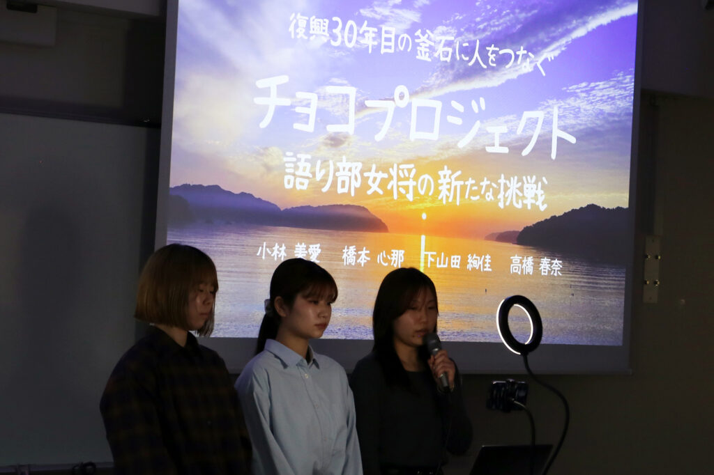 「語り部女将」岩﨑氏が手がける新たなチョコレート事業「ぷらーじょねばま」の起業を支援。学生が岩﨑氏とともに起業塾に参加し、起業に関する学びを深めました。マーケティング、パッケージデザイン、販売までをサポートし、人と人をつなぐ想いをチョコレートという形に込め、地域と未来を結ぶ岩﨑氏の挑戦を応援しました。
