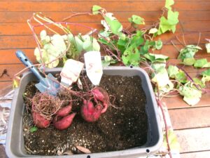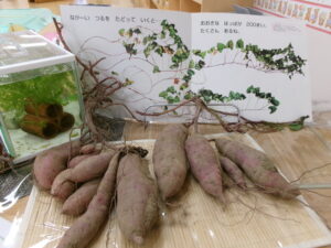 掘り出したお芋とは別のさつまいもですが、ふらっと文京の受付カウンターにツル付き、泥付きのさつまいもを展示していますので、ぜひ見てみてくださいね♪