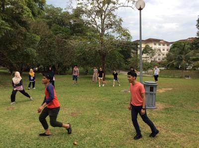 ・腹ごなしも兼ねて、表の芝生で運動です。マレーシアの伝統遊戯である、ガラ・パンジャンという、二組に分かれての通せんぼのようなゲームと、だるまさんが転んだを皆で楽しみました。