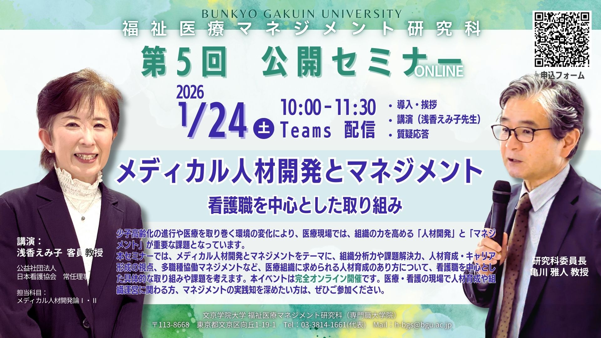 ニュース・メディア掲載 新着 メディア掲載 重要なお知らせ 2025.12.23【福祉医療マネジメント研究科】オンライン公開セミナー メディカル人材開発とマネジメント―看護職を中心とした取り組み― を開催します!2025.12.11【福祉医療マネジメント研究科】オンライン公開ディスカッション松下博宣教授と紐解く ウェルビーイング × 福祉医療マネジメント ― 医療職のための”IKI-IKI”マネジメント対談 ―を開催します!2025.12.10【外国語学研究科】授業公開を開催いたします。 Read More 2025.07.15【外国語学研究科】2025年7月5日 『International Journal of Automation Technology』掲載 外国語学部 仲田知弘准教授の共同論文が掲載されました2025.06.092025年6月8日 『月刊フードケミカル(2025年6月号)』 掲載 大学院 保健医療科学研究科 卒業生の共著論文が紹介されました2025.05.282025年5月28日 『日本経済新聞』掲載 福祉医療マネジメント研究科(専門職大学院) 亀川雅人委員長・特任教授の取材記事が紹介されました Read More 2024.05.24【看護学研究科】2024年度院生募集・9月入学特別入試 6月実施 のご案内(再掲出)2024.04.08【看護学研究科】2024年度院生募集・9月入学特別入試(6月実施)のご案内2024.01.30【看護学研究科】2024年度院生募集・特別入試(3月)のご案内 Read More 大学院の特徴 リカレント教育に最適な環境がここにある 外国語学研究科 世界中の文献やニュースに触れながら 実務レベルで英語を使える力を育成 Read More 経営学研究科 ビジネスの現場を意識した学びで 実践力と豊かな知識を身につける Read More 人間学研究科 共生社会に向け、 高度な専門性と豊かな人間性を育成 Read More 保健医療科学研究科 実践的能力、応用的能力を備えた チーム医療のリーダーを目指す Read More 看護学研究科 人々の生活や健康のため 教育的な支援ができる看護専門職を目指す Read More 福祉医療マネジメント研究科(専門職大学院) 経営学の基礎から応用までを学び 福祉医療分野の専門知識を有効に活用する 高度専門職人材を育成する Read More