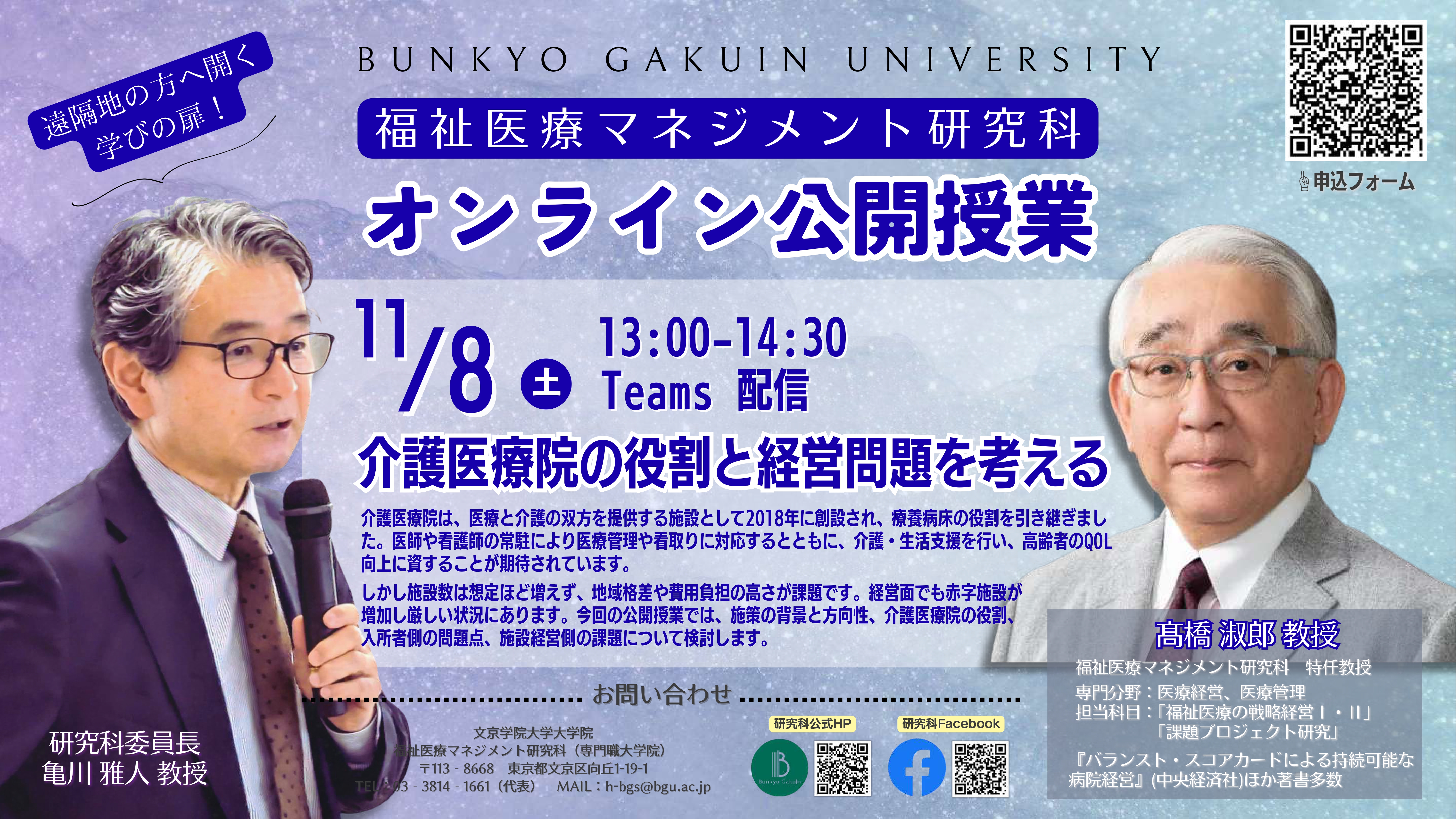 【福祉医療マネジメント研究科】第6回オンライン公開授業開催!髙橋淑郎教授「介護医療院の役割と経営問題を考える」