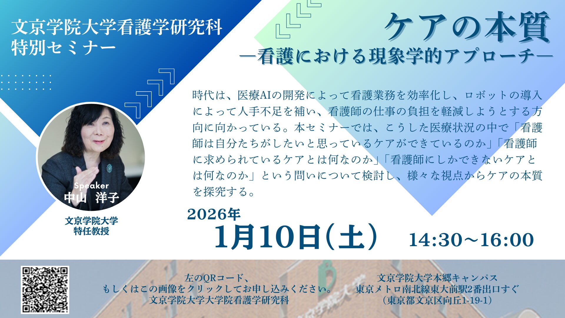 看護関連に携わっている方を対象に、文京学院大学大学院 看護学研究科の特別セミナーを開催いたします。※受講無料