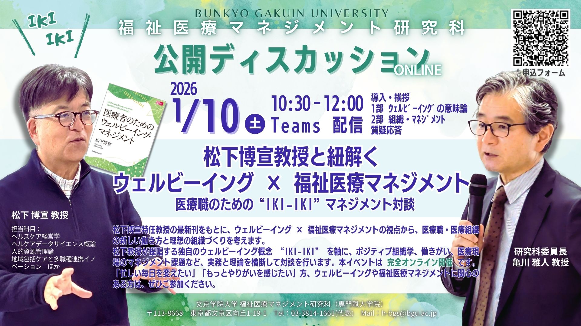 【福祉医療マネジメント研究科】オンライン公開ディスカッション松下博宣教授と紐解く ウェルビーイング × 福祉医療マネジメント ― 医療職のための”IKI-IKI”マネジメント対談 ―を開催します!