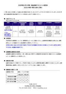 【福祉医療マネジメント研究科】3/9(月)~3/11オンライン特別入試を実施いたします 2026.02.17 ☞ 福祉医療マネジメント研究科の出願資格 ☞ 福祉医療マネジメント研究科 2026年度募集要項 ☞ 募集要項の取り寄せはこちらから(出願には募集要項の原本が必要です) 戻る