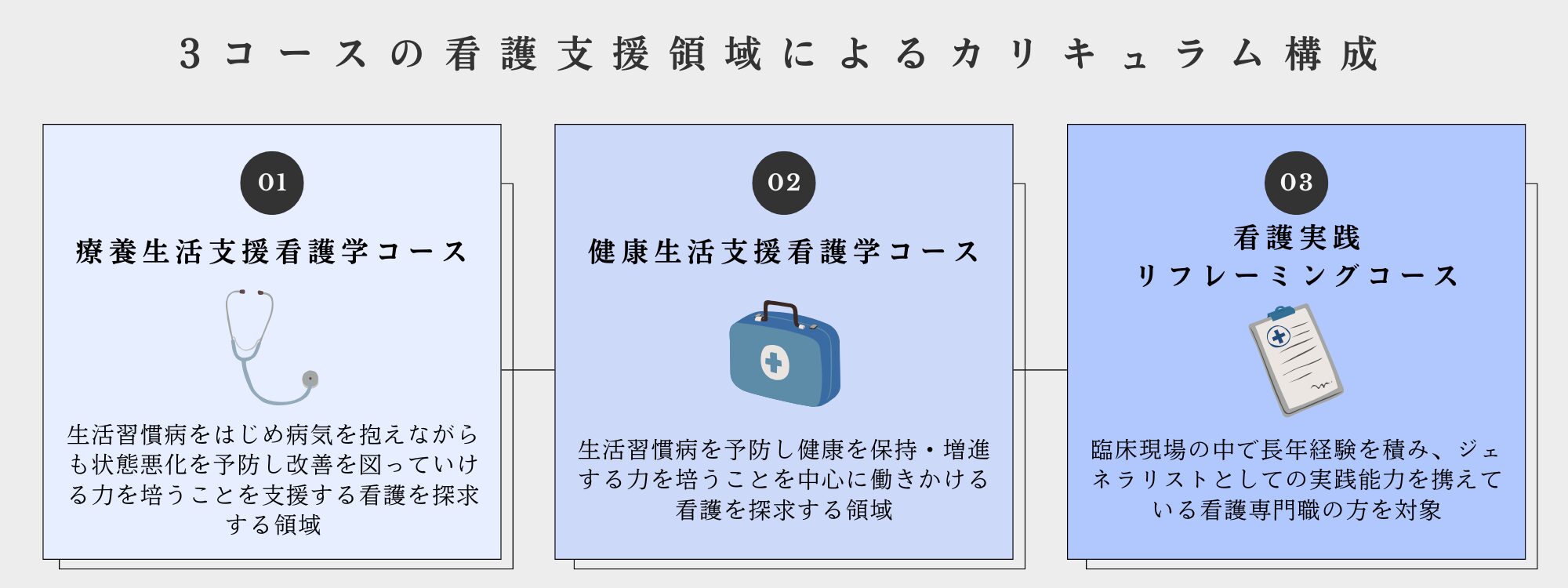人々の尊厳を守りながら個々人の意思決定を支え、その人が望む生活を営むために必要な健康行動を獲得し、直面した健康問題を解決できる能力を身につけることを支援する教育的な看護を実践できる人材育成を目指しています。