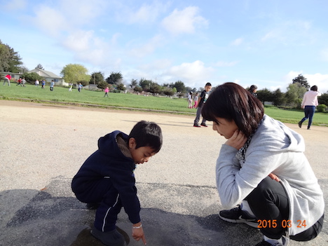 The students go to two elementary schools, Linscott Charter School for 10 students and Del Mar School for 6 students for their internships this Monday and Tuesday. In Del Mar, three pairs of two go to three different Kindergarten classes. In this photo, two students were asked about Japan such as “Are there any differences between Japanese schools and American schools?” and “What do children in Japan do for fun?” The students would not have been able to answer these questions without a translator who happened to be there. It was pitiful!