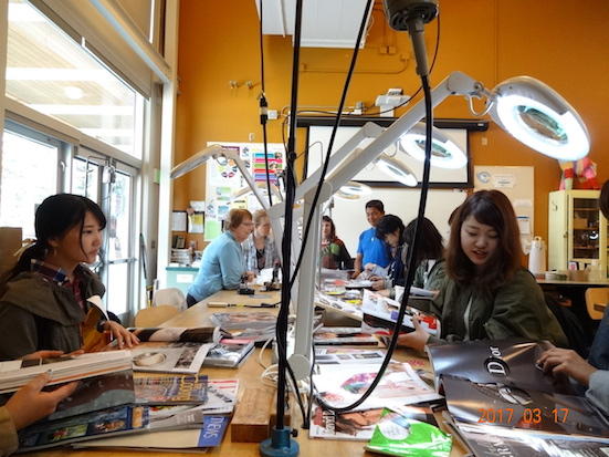 こちらのグループは、雑誌の切り抜きなどを使って、バッジ作りをしているところです、