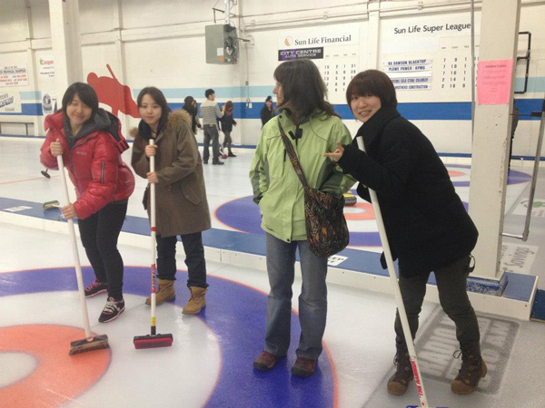 午後はカーリングです。Kamloopsのカーリング場は、全日本の本橋麻里さんも練習に来る所だそうです。すごいですね。そんなところで、実際にカーリングの練習体験をさせてもらいました。ストーンは20キログラムもあり、重かったです。。