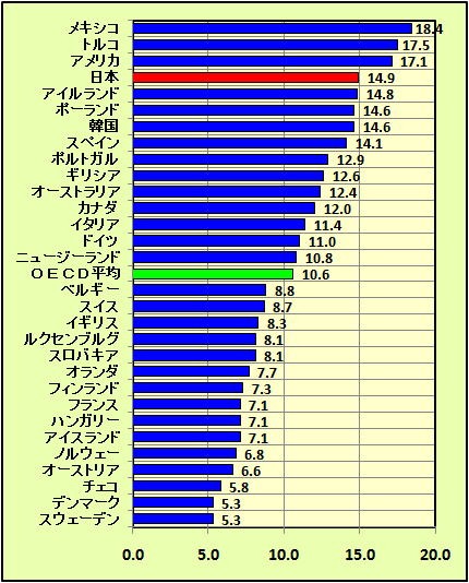 このデータをご覧ください!!日本は貧困ランキング4位に入っています。