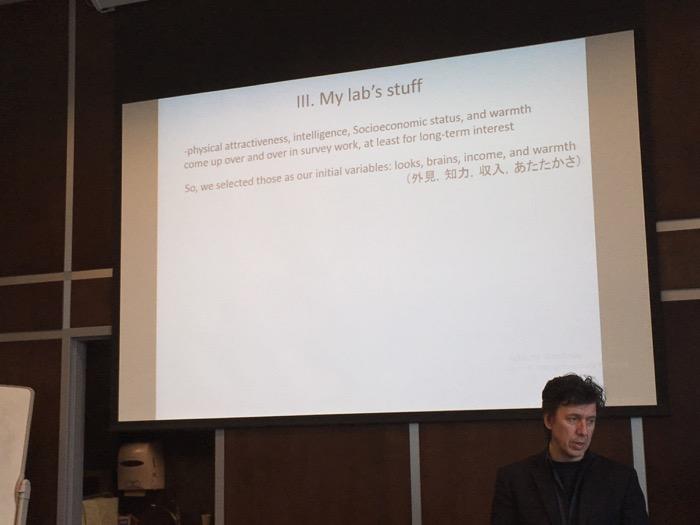 まず、マイクは、実験においてOnline Datingのサイトと同じような画面を作成しました。今回の報告は、主に女性が男性の情報を評価する場面を想定したものです。男性のモデル画像を沢山のデータベースから引っぱってきたこと、それに対して外見的魅力、知性、収入、あたたかさ、という4つの変数を設けてこれを操作した刺激を作成したことを説明してくれました。4要因の実験計画ですね。