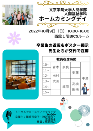 人間学部人間福祉学科のホームカミングデイが、あやめ祭の2日目、10月9日(日)10:00~16:00に開催されます。