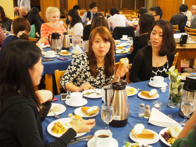 本日B.S.I.S.参加学生は3週間の課程を終え、修了式を迎えました。修了式では、まず神学部のチャペルで大学の成り立ちなどについて説明を受けた後、これまで授業を担当して下さった先生方、メンターとして日々の生活をサポートしてくれた現地の学生たちと共にアメリカの伝統的な食事であるThanksgiving Dinnerを楽しみました。午後からは大雪となり、最後まで日本とは異なる風土、社会、文化について学ぶ機会に富んだプログラムでした。