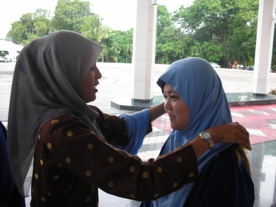 戒律によって、肌や女性の髪の露出が禁じられているため、入口で衣装やスカーフを借りて入場します。