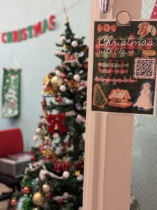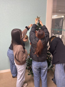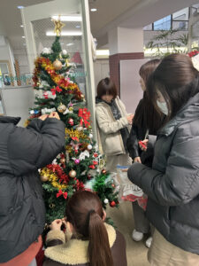 ハロウィンの雰囲気から一変し、学生たちと一緒にクリスマスの飾りつけを行い、あたたかい雰囲気のサロンが完成しました。