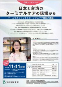 名称:日本と台湾のターミナルケアの現場から~チームマネジメントとターミナルケア体制の課題~日時:2023年11月11日(土)13時~15時30分(開場:12時40分)